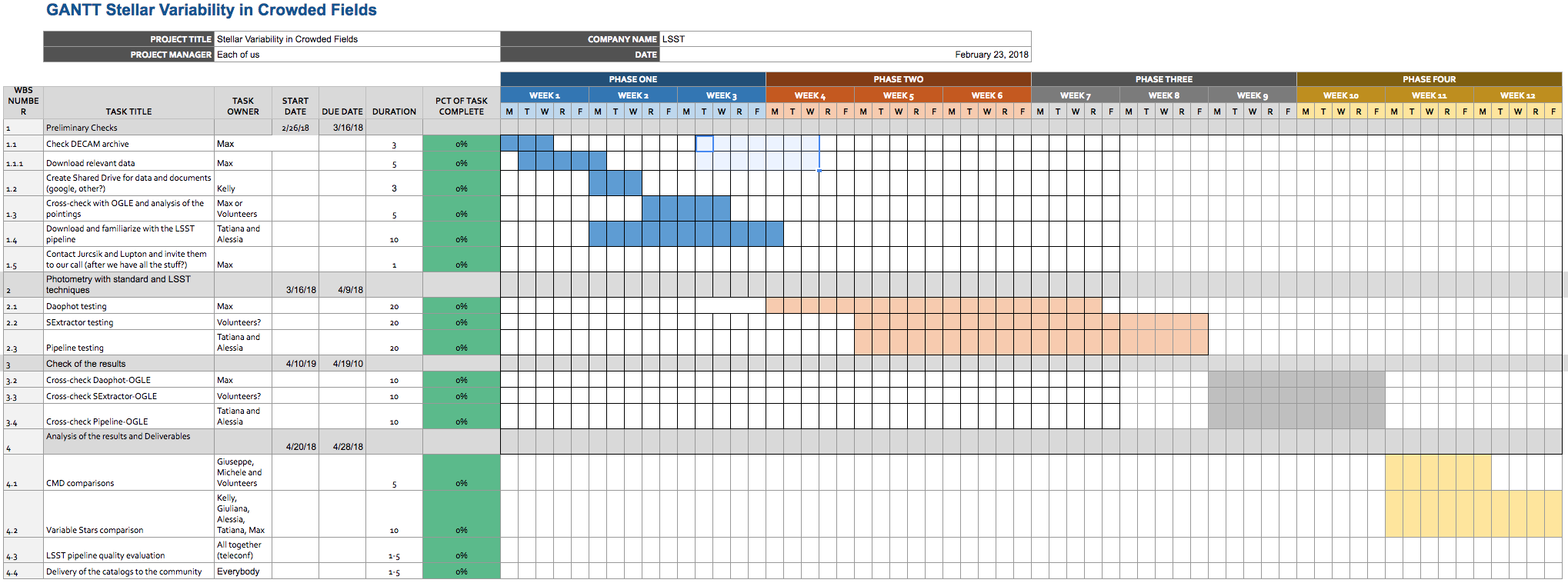 Before we can create a suitable work plan we need to determine the state of the work that is being undertaken by different groups. We plan to hold telecons with the LSST Data Management team and the Dark Energy team to identify where help is needed and what work needs to be done. Our near term goals are to prepare the DECam data set (if this has not already been done), create our own metrics and determine a figure of merit.